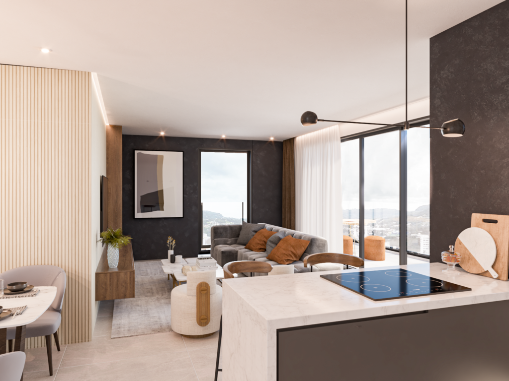 Sala de estar, jantar e cozinha integradas