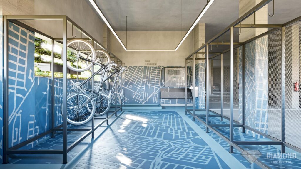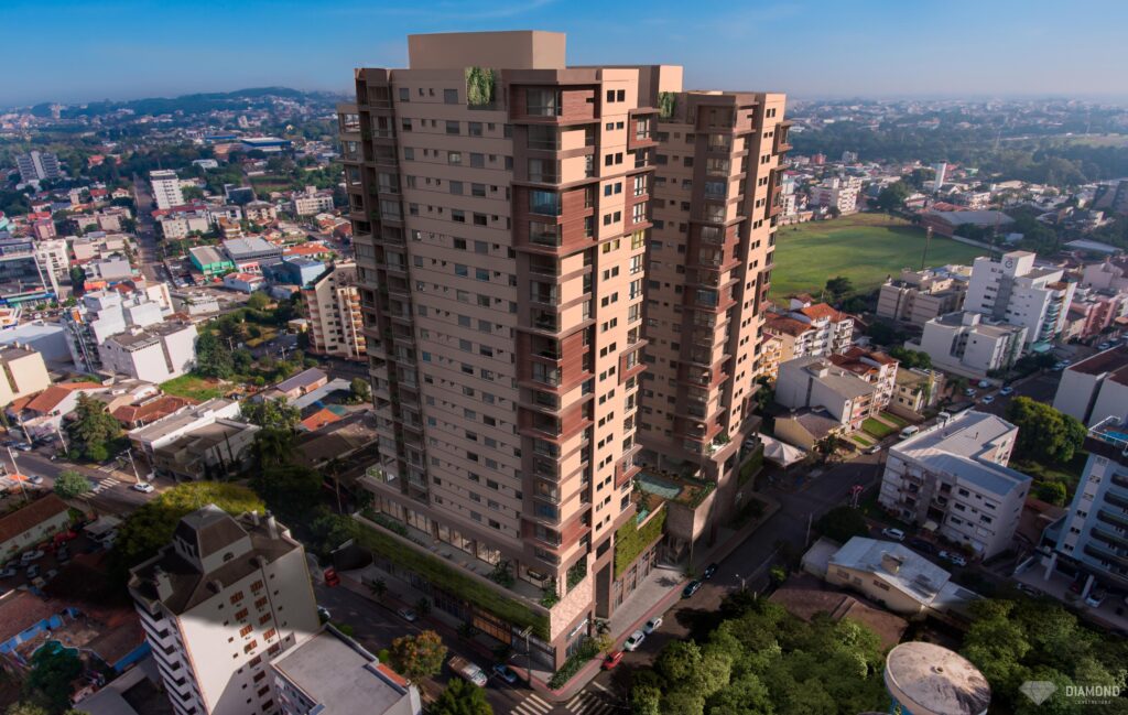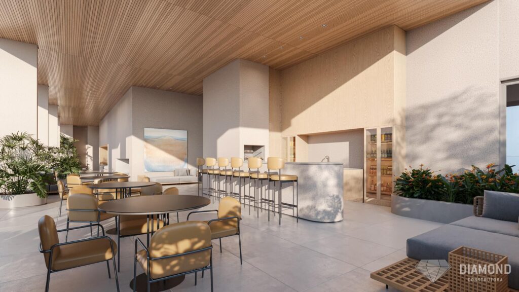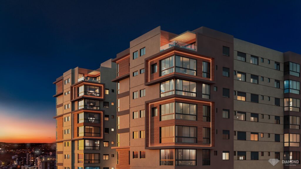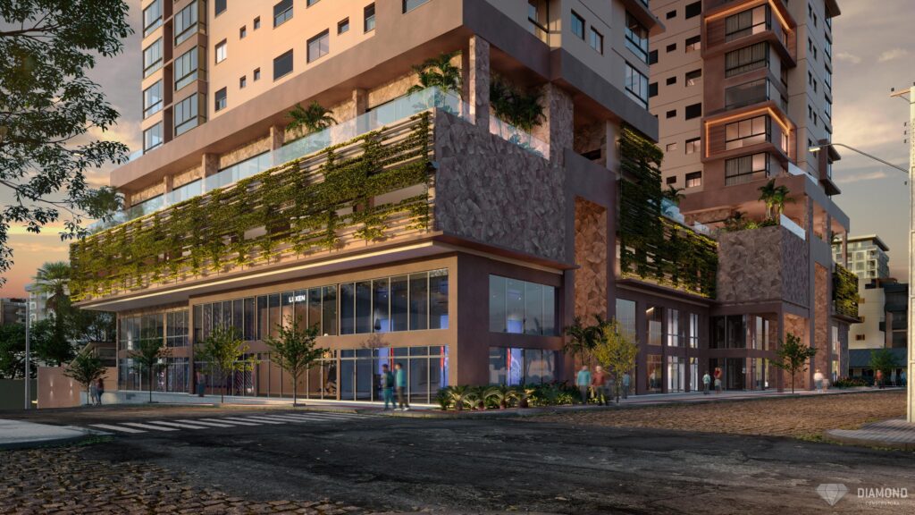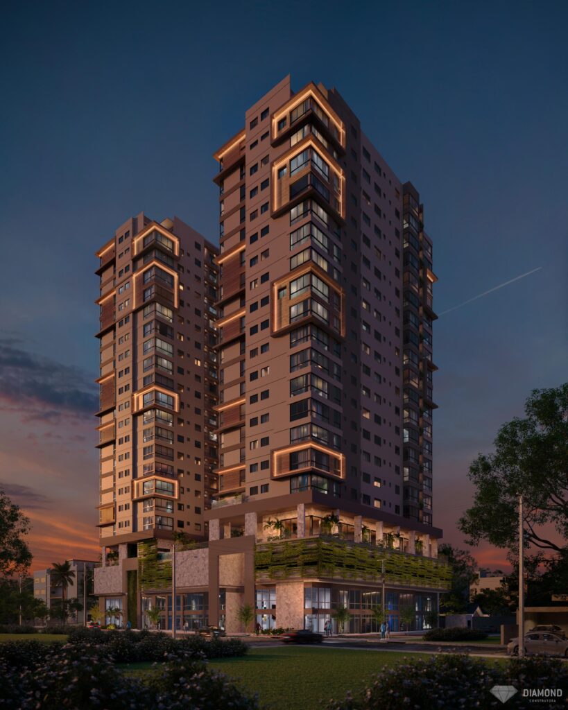 Características do empreendimento: lojas térreas com mezanino, 2 subsolos, 2º pavimento com boxes de estacionamento, 3º pavimento com estruturas de lazer, 4º ao 21º pavimento com apartamentos