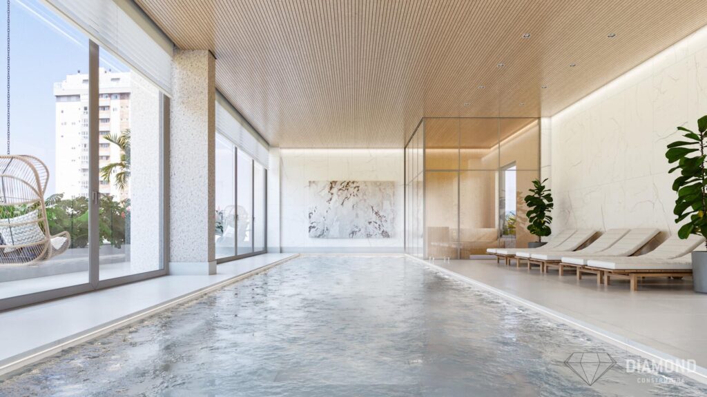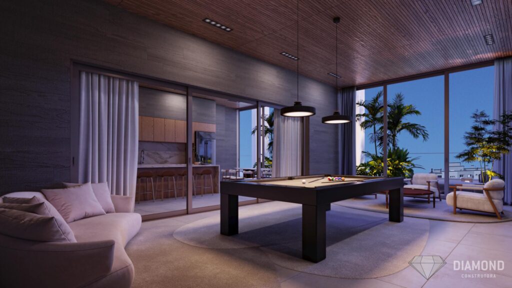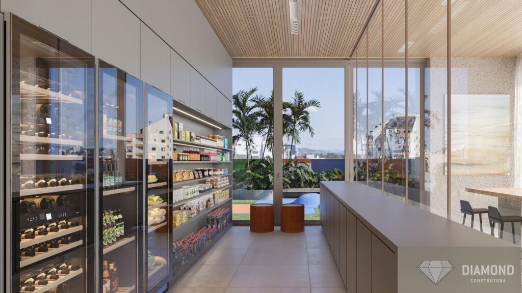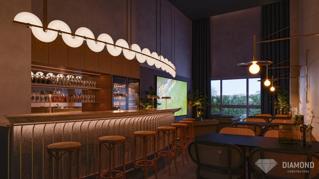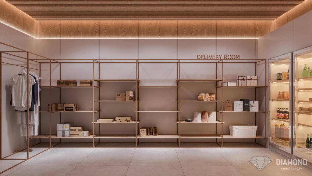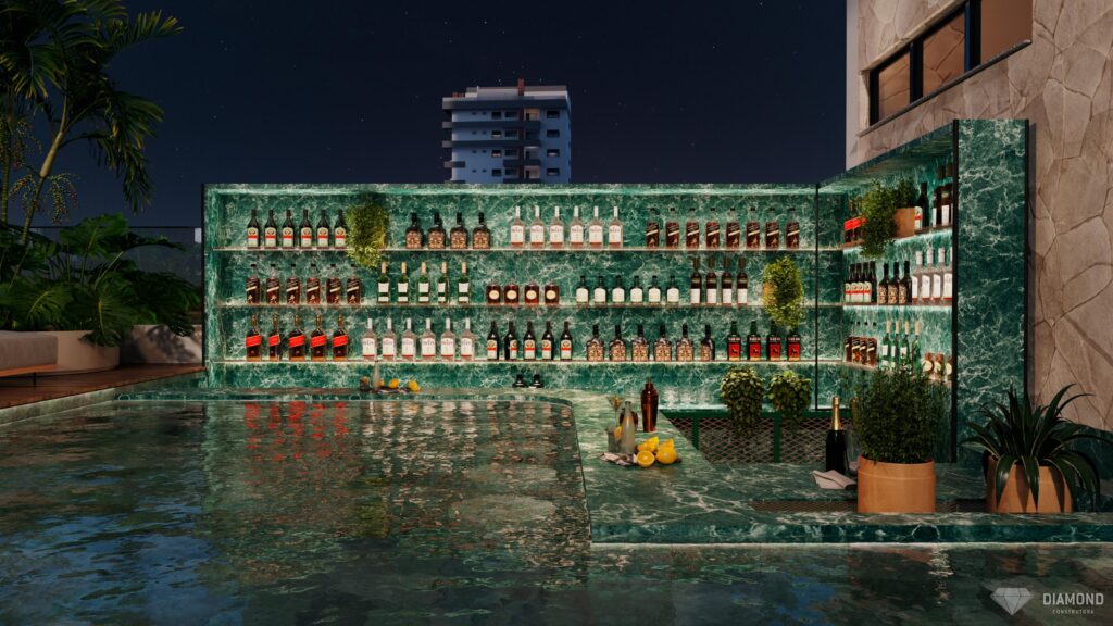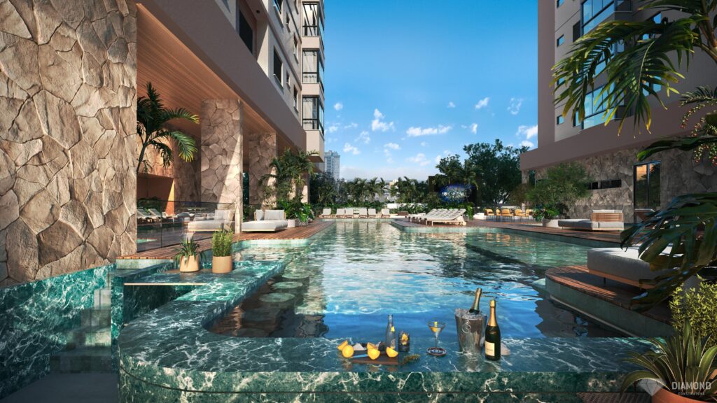 Características do empreendimento: lojas térreas com mezanino, 2 subsolos, 2º pavimento com boxes de estacionamento, 3º pavimento com estruturas de lazer, 4º ao 21º pavimento com apartamentos