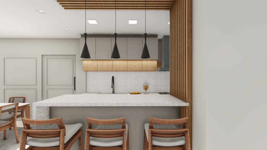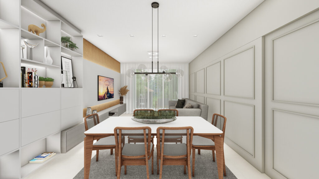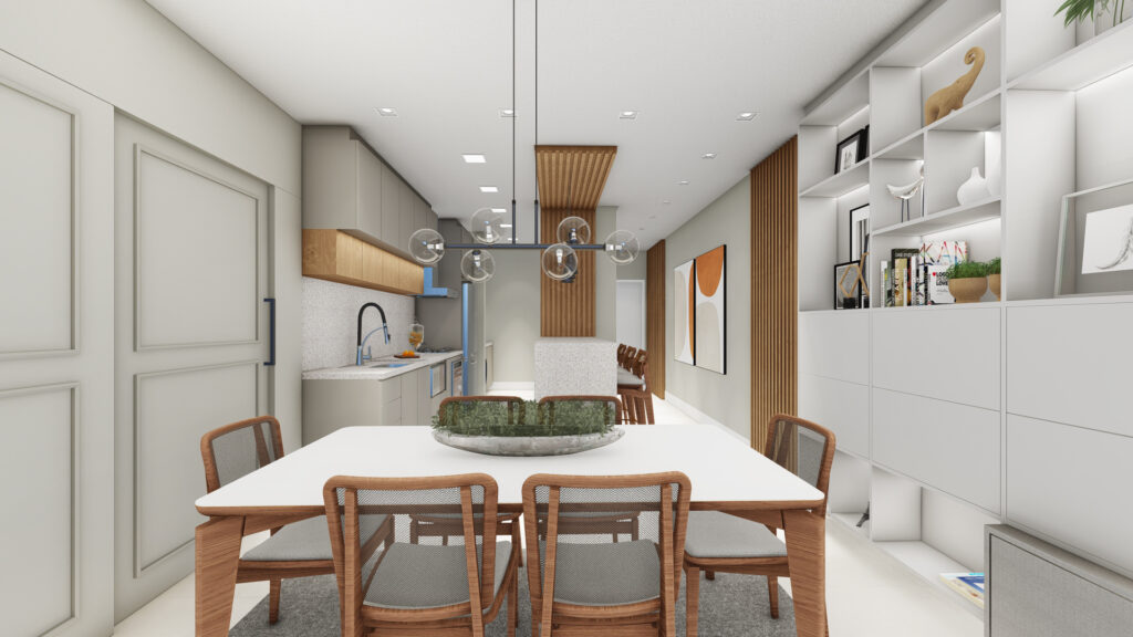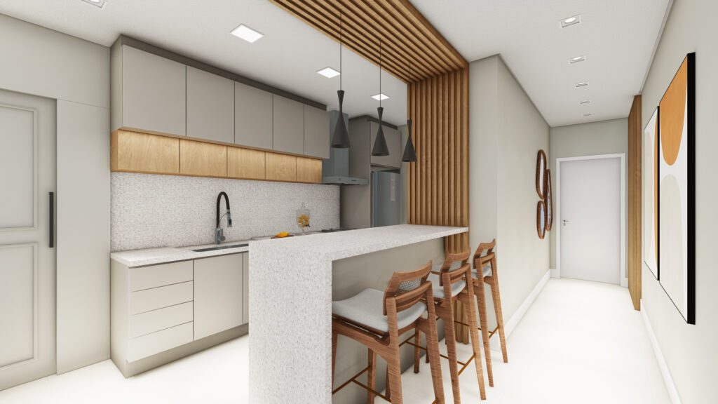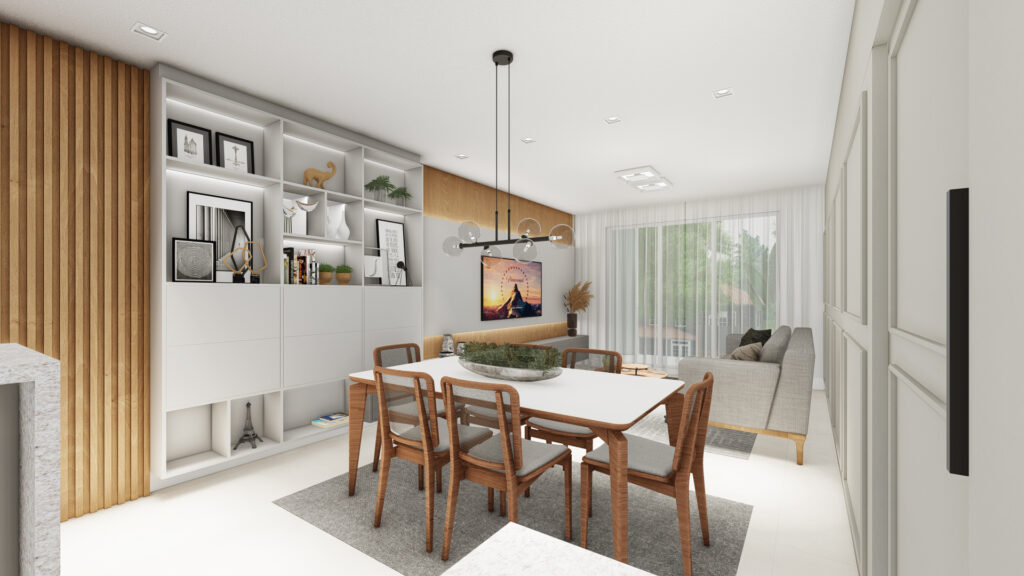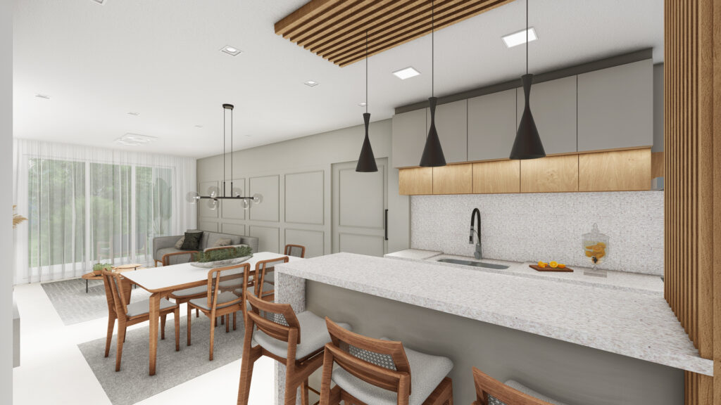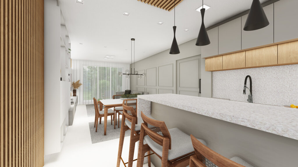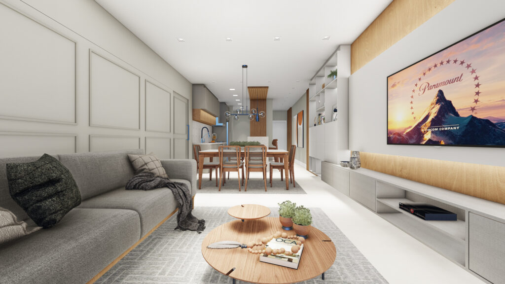 Sala de estar, jantar e cozinha integradas